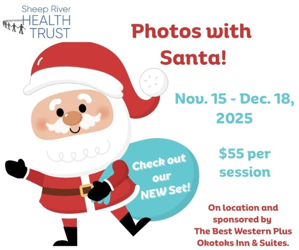Capture some Christmas memories at the Sheep River Health Trust’s Photos with Santa. We will be on location and sponsored by the Best Western Plus Okotoks Inn & Suites. Photo sessions are starting from Nov. 15 until Dec. 18. We are excited to announce that this year we have a NEW SET! Imagine a frosty winter wonderland with snowflakes, an icy blue backdrop with shimmering lights, snowy flocked trees with blue and silver ornaments and of course our jolly old Saint Nick perched on a white wooden bench waiting to hear your Christmas wishes. Visit sheepriverhealthtrust.ca to book today!