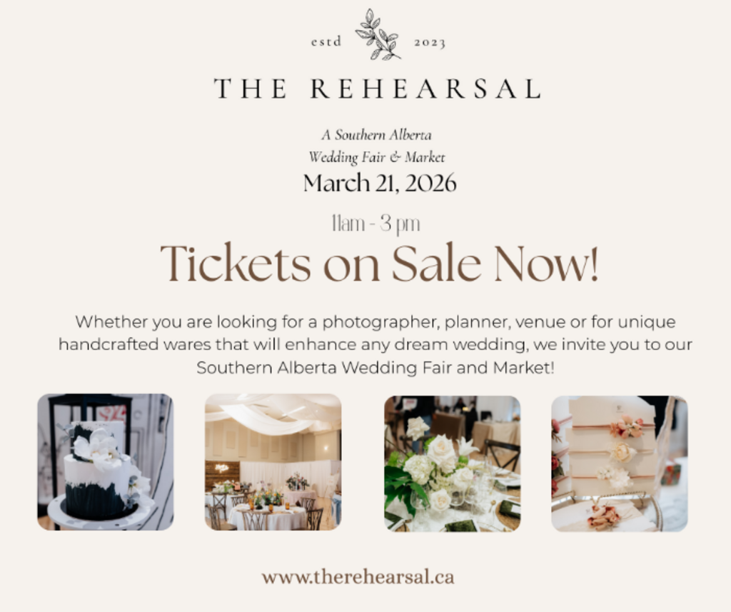 The Rehearsal has become a cornerstone for wedding planning in southern Alberta transforming the often-daunting task of wedding planning into a delightful journey. Join us on March 21, 2026 from 11 am to 3 pm to speak with venues, caterers, florists, decorators and many more to help you plan the wedding of your dreams.