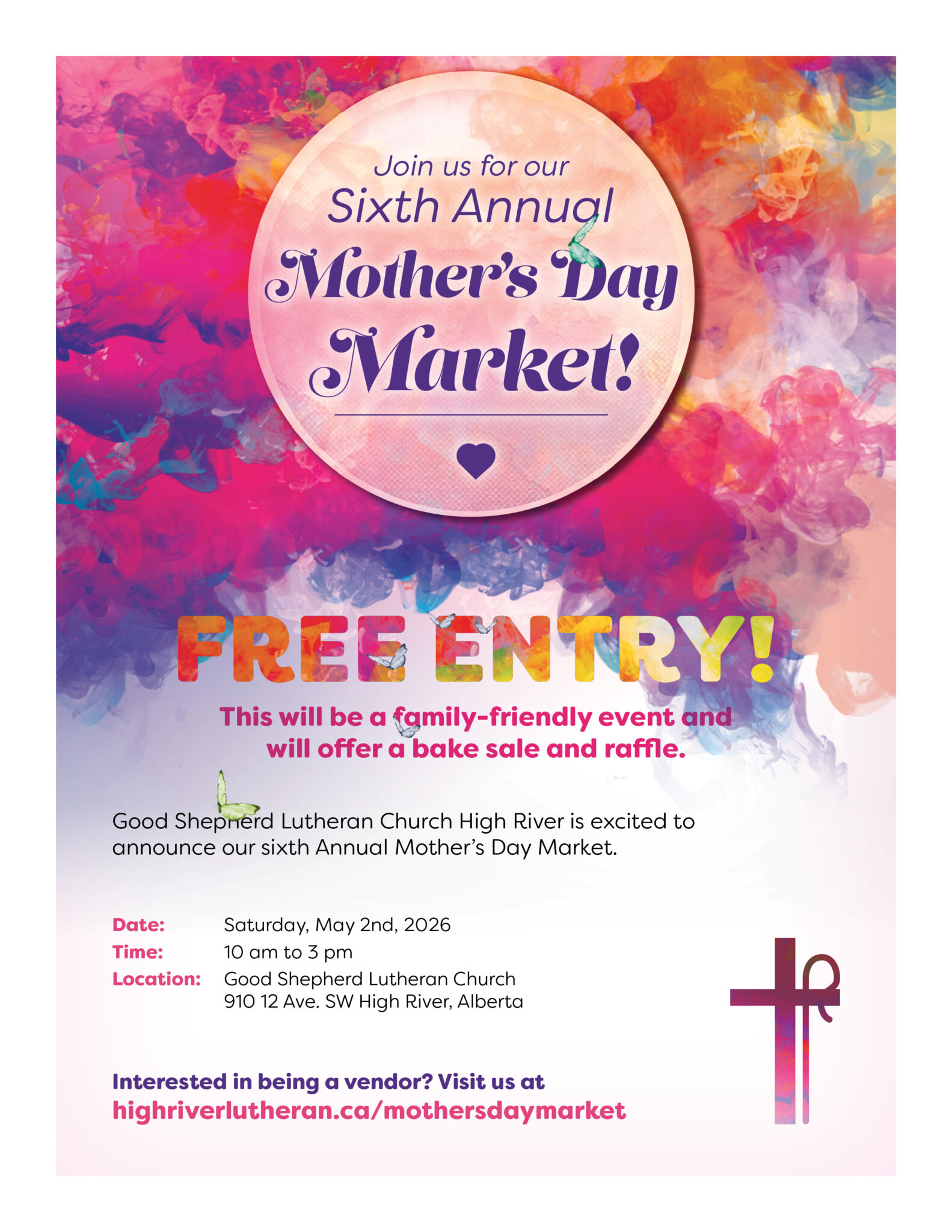 Good Shepherd Lutheran Church is hosting our 6th Annual Mother’s Day Market and Bake Sale on Saturday, May 2nd, 2026 from 10:00 am -3:00 pm. We will have a variety of local vendors showcasing their wares. There is no charge to attend the market. There will also a Raffle for Calgary Co-op Gift Cards worth $300, $200 and $100. Tickets are $2.00 apiece. The draw for the raffle will be Mother Day, May 12. Church is located at 910 – 12 Ave. SW, High River.